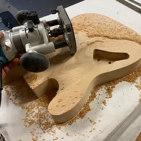 Body widths are set to 51.5mm thick before sanding and finishing. This is done to accommodate custom 8mm thick backplates, allowing the carved patterns to continue across the body and the backplate respectively.