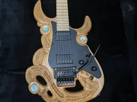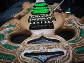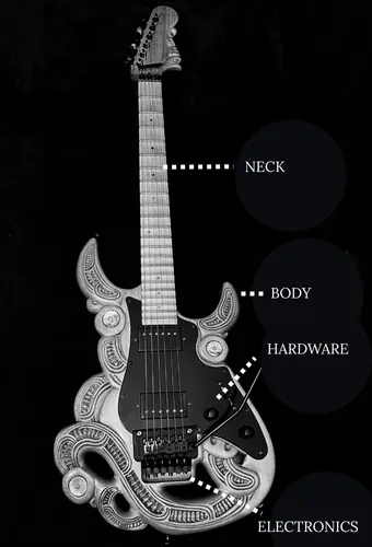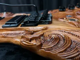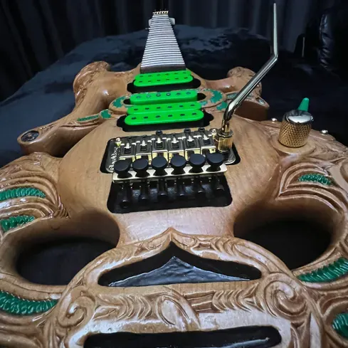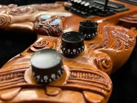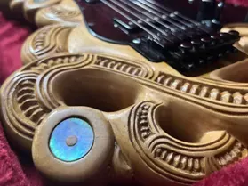 'Tama' - the first carved guitar project and the inspiration to produce this series of Tribal Guitars. Named after legendary New Zealand guitarist; Tama Renata, this guitar was a custom build. One-off, custom builds are an excellent choice if you have a specific design in mind or endorsement restrictions with other guitar manufacturers.
