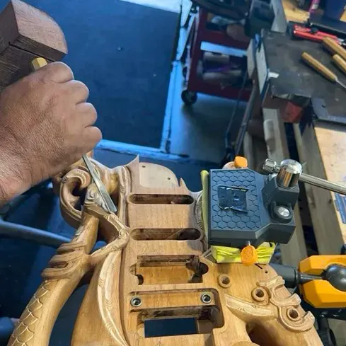 Our Master Carvers either interpret your story, or draw from a collective of traditional patterns, which are then carved into the surface of the guitar.